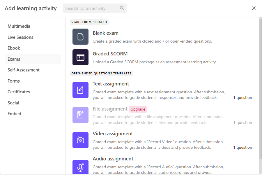 LearnWorlds supports a range of assessment types designed to work alongside its tracking capabilities, rather than sitting separately from them.
