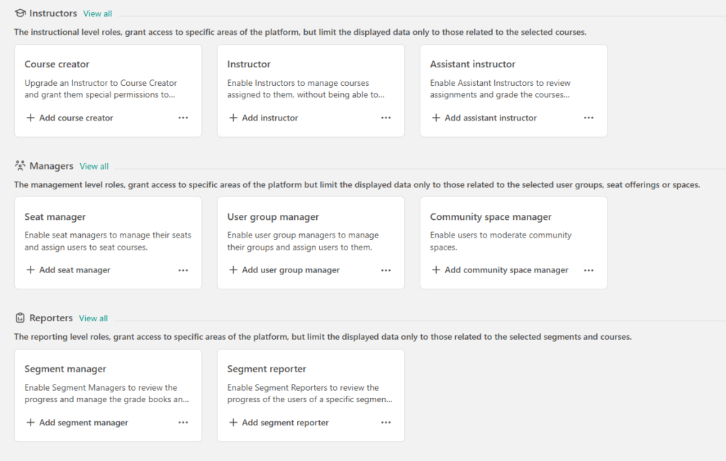 In addition to built-in instructor and admin roles, LearnWorlds now supports custom roles, allowing organisations to define exactly what different users can see and do. This means you can create roles focused on assessment and tracking — for example, giving assessors access to learner attempts, activity data, and grading tools without exposing full administrative controls. Custom roles support clearer separation of duties and help align platform access with real assessment workflows.