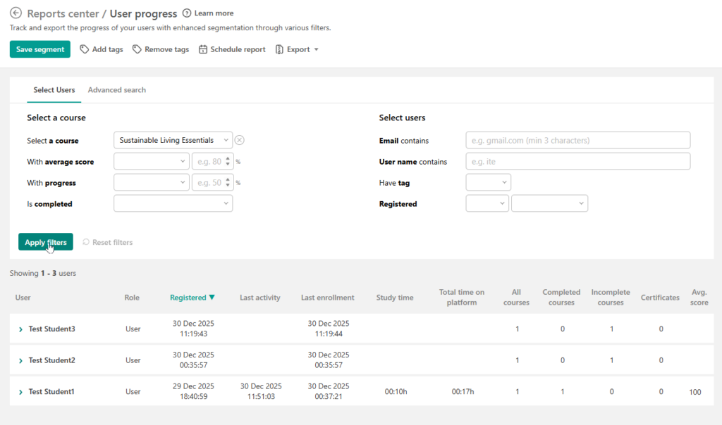 For xAPI-enabled content, LearnWorlds can record more granular learning activity, capturing detailed statements about what learners did, not just whether they finished. This is an important distinction, because many LMS platforms that advertise “SCORM compatibility” do so by embedding content as a web object rather than truly tracking it. In those cases: